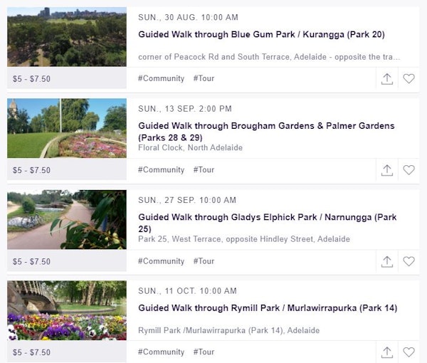 For any of the above walks, please book here: https://www.eventbrite.com.au/o/adelaide-park-lands-preservation-association-30241428470 Tickets are - $7,50 adult (age 16 and over),